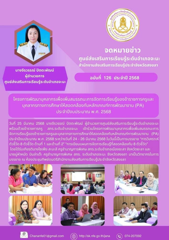 นางจีรวรรณ์ ปัตตะพัฒน์ ผู้อำนวยการศูนย์ส่งเสริมการเรียนรู้ระดับอำเภอจะนะ เข้าร่วมประชุมรับนโยบายและแนวทางการดำเนินงานส่งเสริมการเรียนรู้ ประจำปีงบประมาณ พ.ศ. 2569 พร้อมทั้งคณะบุคลากรสำนักงานส่งเสริมการเรียนรู้ประจำจังหวัดสงขลา ร่วมรับฟังนโยบายและแนวทางการ 7 / ต.ค. / 2568
