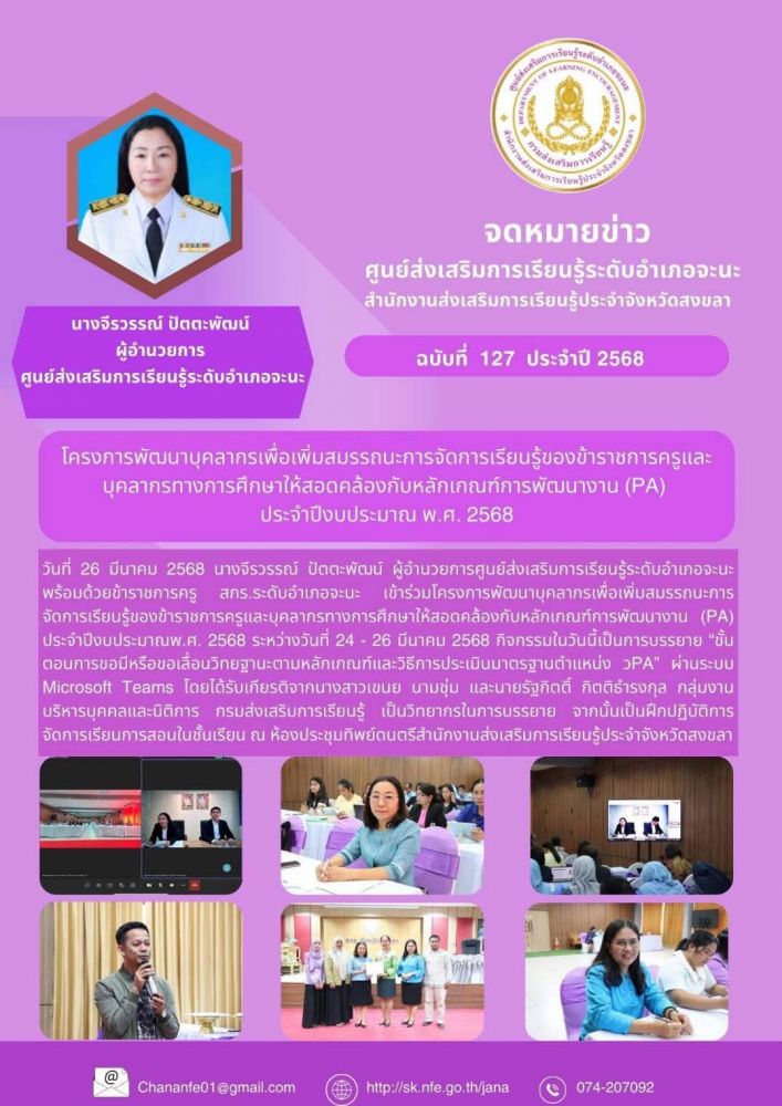 นางจีรวรรณ์ ปัตตะพัฒน์ ผู้อำนวยการศูนย์ส่งเสริมการเรียนรู้ระดับอำเภอจะนะ เข้าร่วมประชุมรับนโยบายและแนวทางการดำเนินงานส่งเสริมการเรียนรู้ ประจำปีงบประมาณ พ.ศ. 2569 พร้อมทั้งคณะบุคลากรสำนักงานส่งเสริมการเรียนรู้ประจำจังหวัดสงขลา ร่วมรับฟังนโยบายและแนวทางการ 7 / ต.ค. / 2568