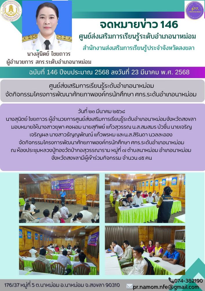 นางสุนิตย์ ไชยถาวร ผู้อำนวยการศูนย์ส่งเสริมการเรียนรู้ระดับอำเภอนาหม่อมจังหวัดสงขลา มอบหมายให้นางสาวยุพา คงผอม นายสุทิพย์ แก้วสุวรรณ น.ส.สมสมร บัวชื่น นายเจริญ เจริญผล นางสาวธัญญพัณณ์ แก้วพรหม และน.ส.สิรินดา นวลละออง จัดกิจกรรมโครงการพัฒนาศักยภาพองค์กรนักศึกษา ศกร.ระดับอำเภอนาหม่อม