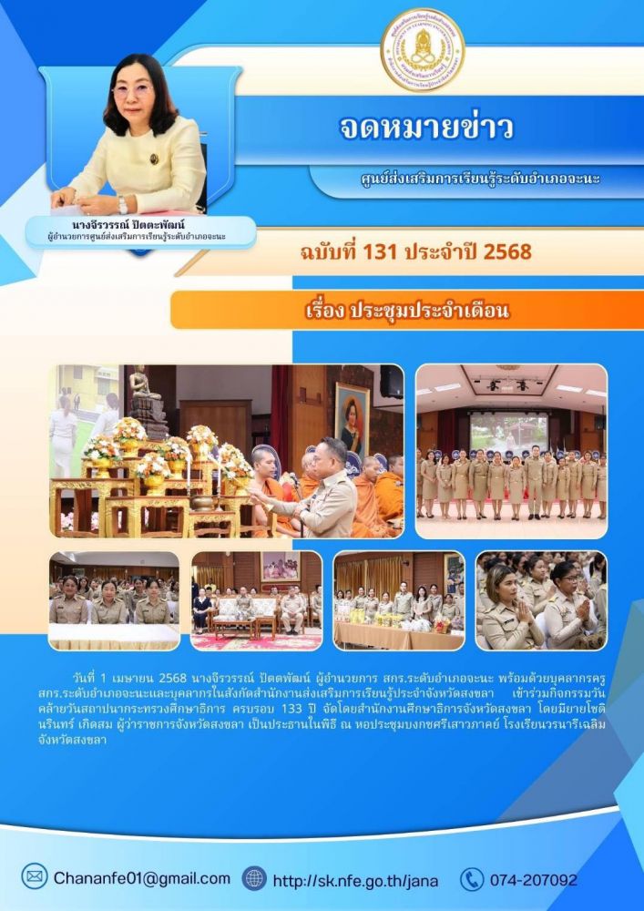 นางจีรวรรณ์ ปัตตะพัฒน์ ผู้อำนวยการศูนย์ส่งเสริมการเรียนรู้ระดับอำเภอจะนะ เข้าร่วมประชุมรับนโยบายและแนวทางการดำเนินงานส่งเสริมการเรียนรู้ ประจำปีงบประมาณ พ.ศ. 2569 พร้อมทั้งคณะบุคลากรสำนักงานส่งเสริมการเรียนรู้ประจำจังหวัดสงขลา ร่วมรับฟังนโยบายและแนวทางการ 7 / ต.ค. / 2568