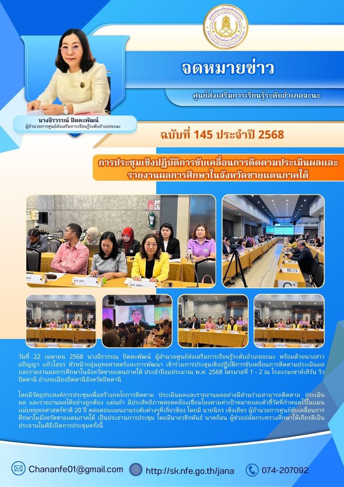 นางจีรวรรณ์ ปัตตะพัฒน์ ผู้อำนวยการศูนย์ส่งเสริมการเรียนรู้ระดับอำเภอจะนะ เข้าร่วมประชุมรับนโยบายและแนวทางการดำเนินงานส่งเสริมการเรียนรู้ ประจำปีงบประมาณ พ.ศ. 2569 พร้อมทั้งคณะบุคลากรสำนักงานส่งเสริมการเรียนรู้ประจำจังหวัดสงขลา ร่วมรับฟังนโยบายและแนวทางการ 7 / ต.ค. / 2568
