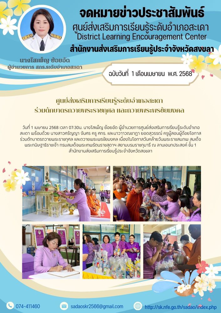 ศูนย์ส่งเสริมการเรียนรู้ระดับอำเภอสะเดา ร่วมตักบาตรถวายพระราชกุศล และถวายพระพรชัยมงคล