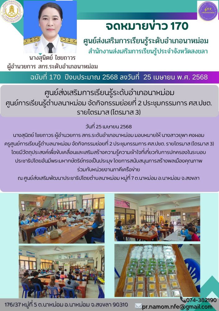 นางสุนิตย์ ไชยถาวร ผู้อำนวยการ สกร.ระดับอำเภอนาหม่อม มอบหมายให้ นางสาวยุพา คงผอม ครูศูนย์การเรียนรู้ตำบลนาหม่อม จัดกิจกรรมย่อยที่ 2 ประชุมกรรมการ ศส.ปชต. รายไตรมาส (ไตรมาส 3) โดยมีวัตถุประสงค์เพื่อขับเคลื่อนและเสริมสร้างความรู้ความเข้าใจที่เกี่ยวกับการปกครองในระบอบประชาธิปไตยอันมีพระมหากษัตริย์ทรงเป็นประมุข โดยการสนับสนุนการสร้างพลเมืองคุณภาพร่วมกับหน่วยงานภาคีเครือข่าย