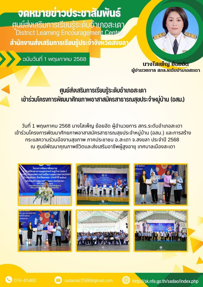 ศูนย์ส่งเสริมการเรียนรู้ระดับอำเภอสะเดา เข้าร่วมโครงการพัฒนาศักยภาพอาสาสมัครสาธารณสุขประจำหมู่บ้าน (อสม.)