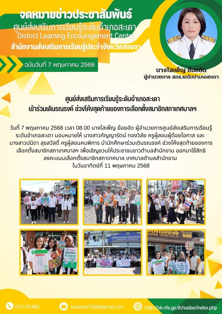 ศูนย์ส่งเสริมการเรียนรู้ระดับอำเภอสะเดา เข้าร่วมเดินรณรงค์ ช่วงโค้งสุดท้ายของการเลือกตั้งสมาชิกสภาเทศบาลฯ
