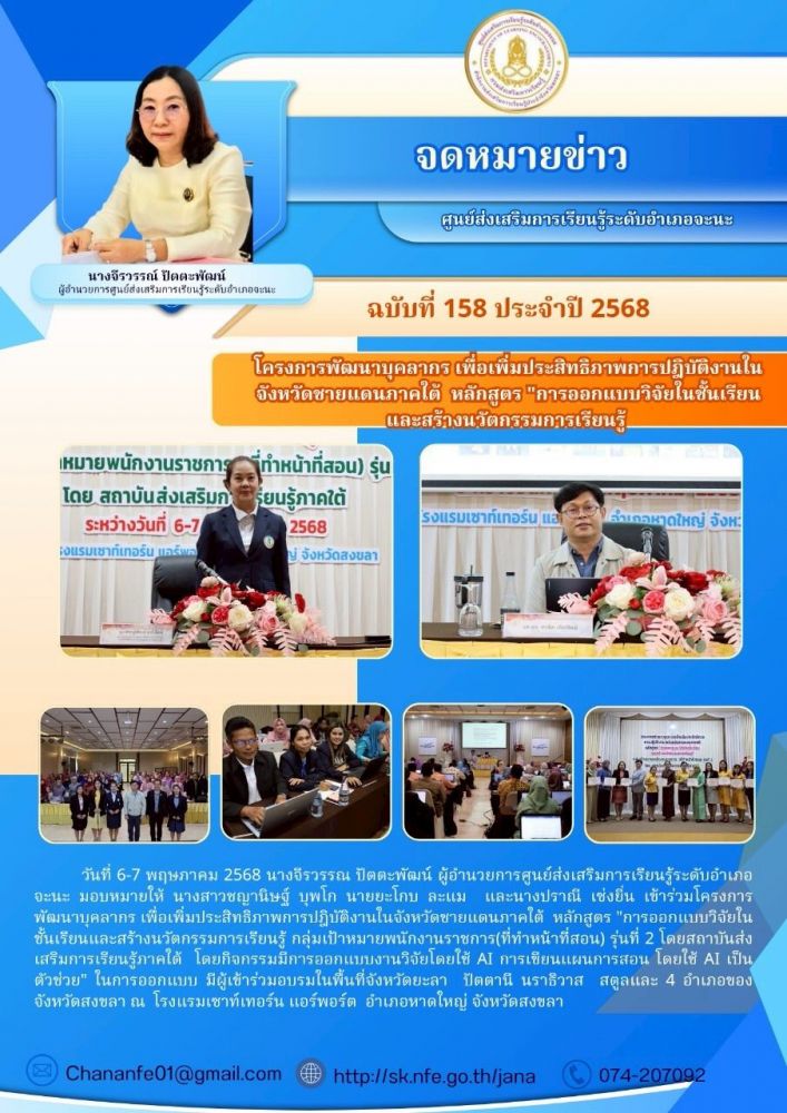 โครงการพัฒนาบุคลากร เพื่อเพิ่มประสิทธิภาพการปฎิบัติงานในจังหวัดชายแดนภาคใต้ หลักสูตร \"การออกแบบวิจัยในชั้นเรียนและสร้างนวัตกรรมการเรียนรู้