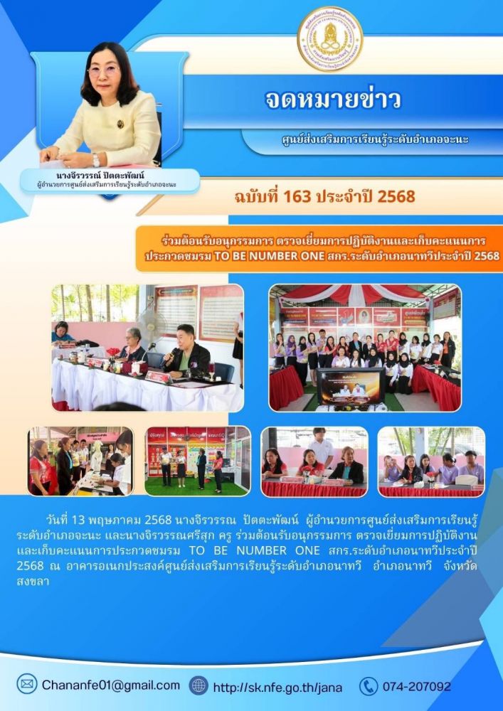 นางจีรวรรณ์ ปัตตะพัฒน์ ผู้อำนวยการศูนย์ส่งเสริมการเรียนรู้ระดับอำเภอจะนะ เข้าร่วมประชุมรับนโยบายและแนวทางการดำเนินงานส่งเสริมการเรียนรู้ ประจำปีงบประมาณ พ.ศ. 2569 พร้อมทั้งคณะบุคลากรสำนักงานส่งเสริมการเรียนรู้ประจำจังหวัดสงขลา ร่วมรับฟังนโยบายและแนวทางการ 7 / ต.ค. / 2568