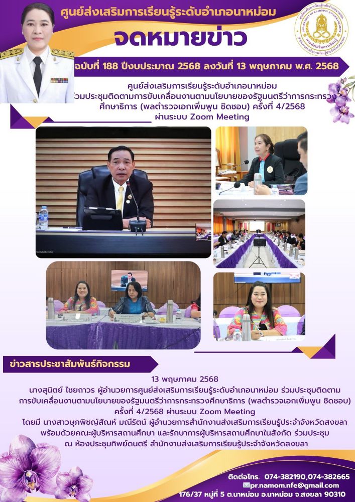ศูนย์ส่งเสริมการเรียนรู้ระดับอำเภอนาหม่อม ร่วมประชุมติดตามการขับเคลื่อนงานตามนโยบายของรัฐมนตรีว่าการกระทรวงศึกษาธิการ (พลตำรวจเอกเพิ่มพูน ชิดชอบ) ครั้งที่ 4/2568 ผ่านระบบ Zoom Meeting