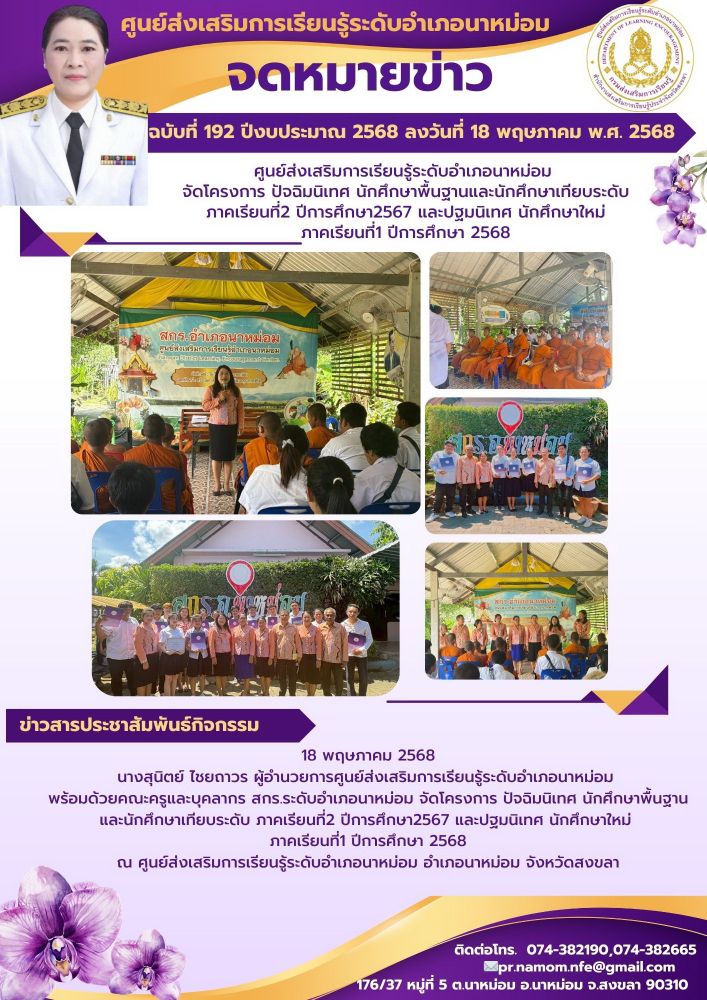 นางสุนิตย์ ไชยถาวร ผู้อำนวยการศูนย์ส่งเสริมการเรียนรู้ระดับอำเภอนาหม่อม พร้อมด้วยคณะครูและบุคลากร สกร.ระดับอำเภอนาหม่อม จัดโครงการ ปัจฉิมนิเทศ นักศึกษาพื้นฐานและนักศึกษาเทียบระดับ ภาคเรียนที่2 ปีการศึกษา2567 และปฐมนิเทศ นักศึกษาใหม่ ภาคเรียนที่1 ปีการศึกษา 2568