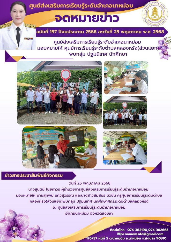 นางสุนิตย์ ไชยถาวร ผู้อำนวยการศูนย์ส่งเสริมการเรียนรู้ระดับอำเภอนาหม่อม มอบหมายให้ นายสุทิพย์ แก้วสุวรรณ และนางสาวสมสมร บัวชื่น ครูศูนย์การเรียนรู้ระดับตำบลคลองหรัง(ส่วนแยก)พบกลุ่ม ปฐมนิเทศ นักศึกษาศกร.ระดับตำบลคลองหรัง