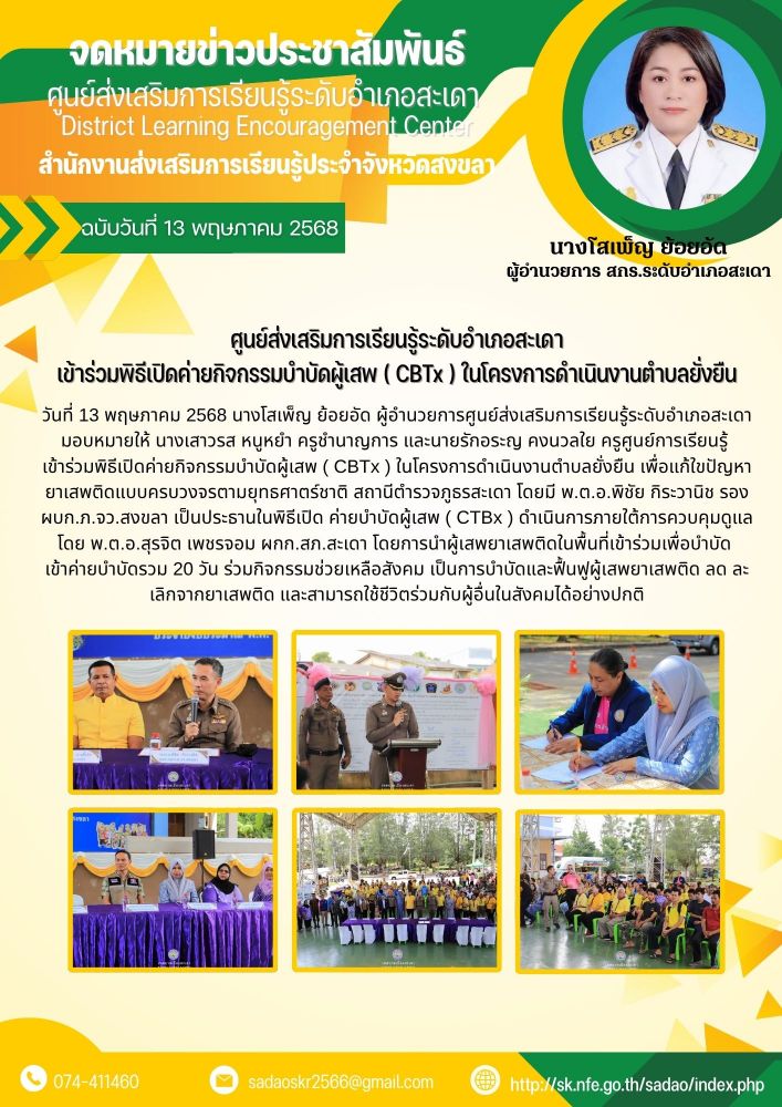 ศูนย์ส่งเสริมการเรียนรู้ระดับอำเภอสะเดา เข้าร่วมพิธีเปิดค่ายกิจกรรมบำบัดผู้เสพ ( CBTx ) ในโครงการดำเนินงานตำบลยั่งยืน