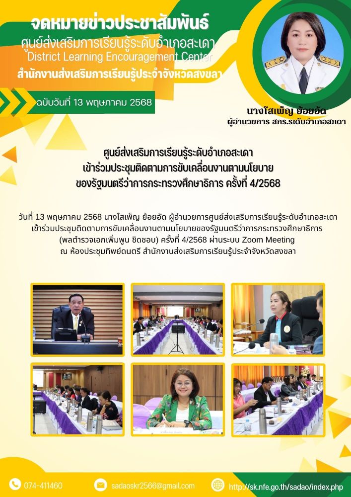 ศูนย์ส่งเสริมการเรียนรู้ระดับอำเภอสะเดา เข้าร่วมประชุมติดตามการขับเคลื่อนงานตามนโยบาย ของรัฐมนตรีว่าการกระทรวงศึกษาธิการ ครั้งที่ 4/2568
