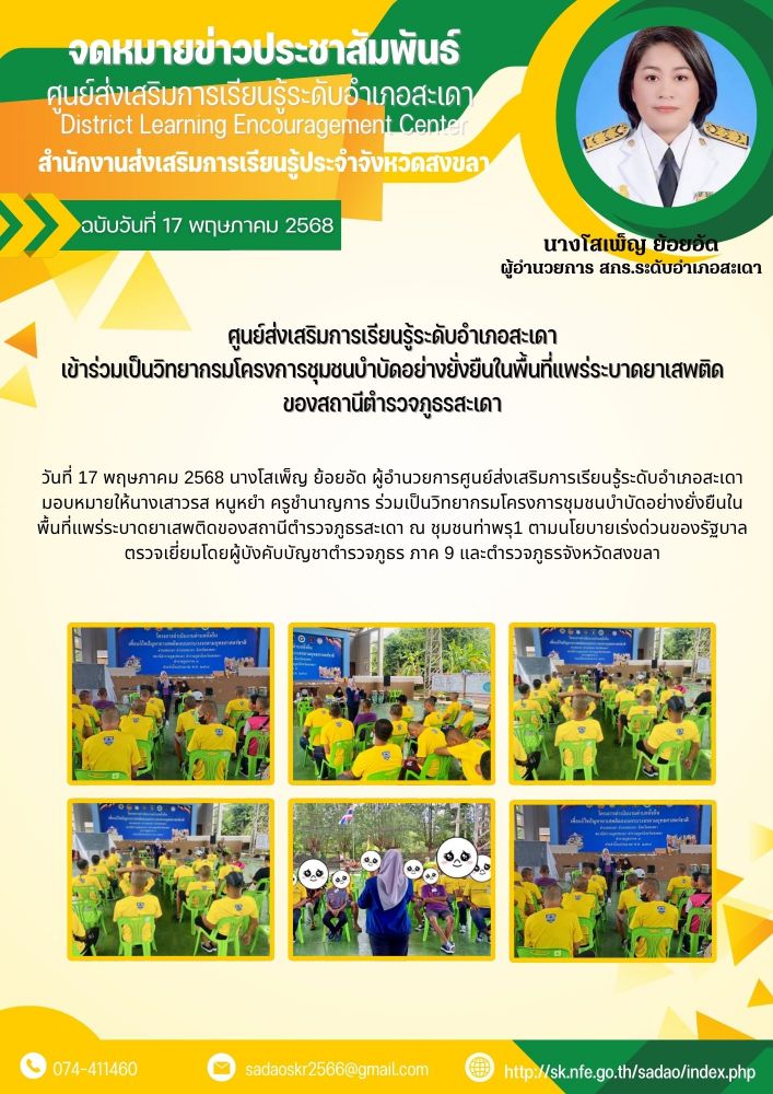 ศูนย์ส่งเสริมการเรียนรู้ระดับอำเภอสะเดา เข้าร่วมเป็นวิทยากรมโครงการชุมชนบำบัดอย่างยั่งยืนในพื้นที่แพร่ระบาดยาเสพติด ของสถานีตำรวจภูธรสะเดา