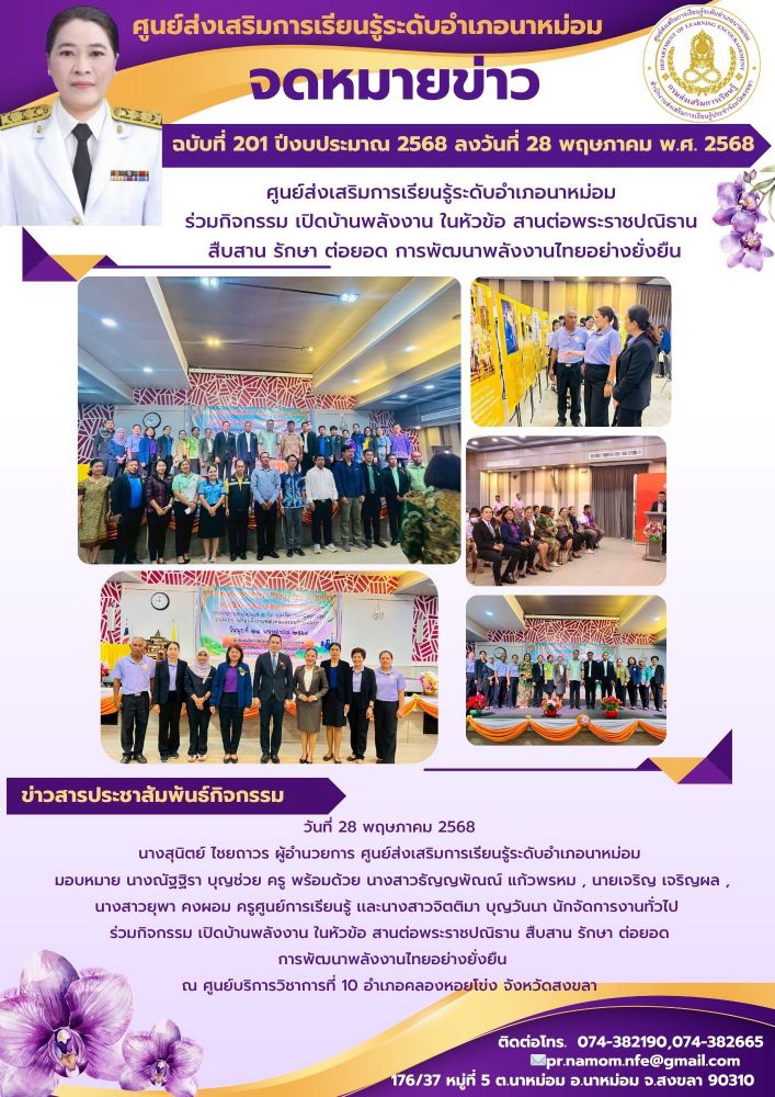 นางสุนิตย์ ไชยถาวร ผู้อำนวยการ ศูนย์ส่งเสริมการเรียนรู้ระดับอำเภอนาหม่อม มอบหมาย นางณัฐฐิรา บุญช่วย ครู พร้อมด้วย นางสาวธัญญพัณณ์ แก้วพรหม , นายเจริญ เจริญผล ,นางสาวยุพา คงผอม ครูศูนย์การเรียนรู้ เเละนางสาวจิตติมา บุญวันนา นักจัดการงานทั่วไป ร่วมกิจกรรม เปิดบ้านพลังงาน ในหัวข้อ สานต่อพระราชปณิธาน สืบสาน รักษา ต่อยอด การพัฒนาพลังงานไทยอย่างยั่งยืน