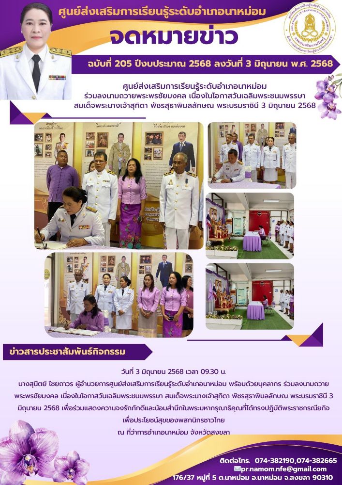 นางสุนิตย์ ไชยถาวร ผู้อำนวยการศูนย์ส่งเสริมการเรียนรู้ระดับอำเภอนาหม่อม พร้อมด้วยบุคลากร ร่วมลงนามถวายพระพรชัยมงคล เนื่องในโอกาสวันเฉลิมพระชนมพรรษา สมเด็จพระนางเจ้าสุทิดา พัชรสุธาพิมลลักษณ พระบรมราชินี 3 มิถุนายน 2568 เพื่อร่วมแสดงความจงรักภักดีและน้อมสำนึกในพระมหากรุณาธิคุณที่ได้ทรงปฏิบัติพระราชกรณียกิจ เพื่อประโยชน์สุขของพสกนิกรชาวไทย