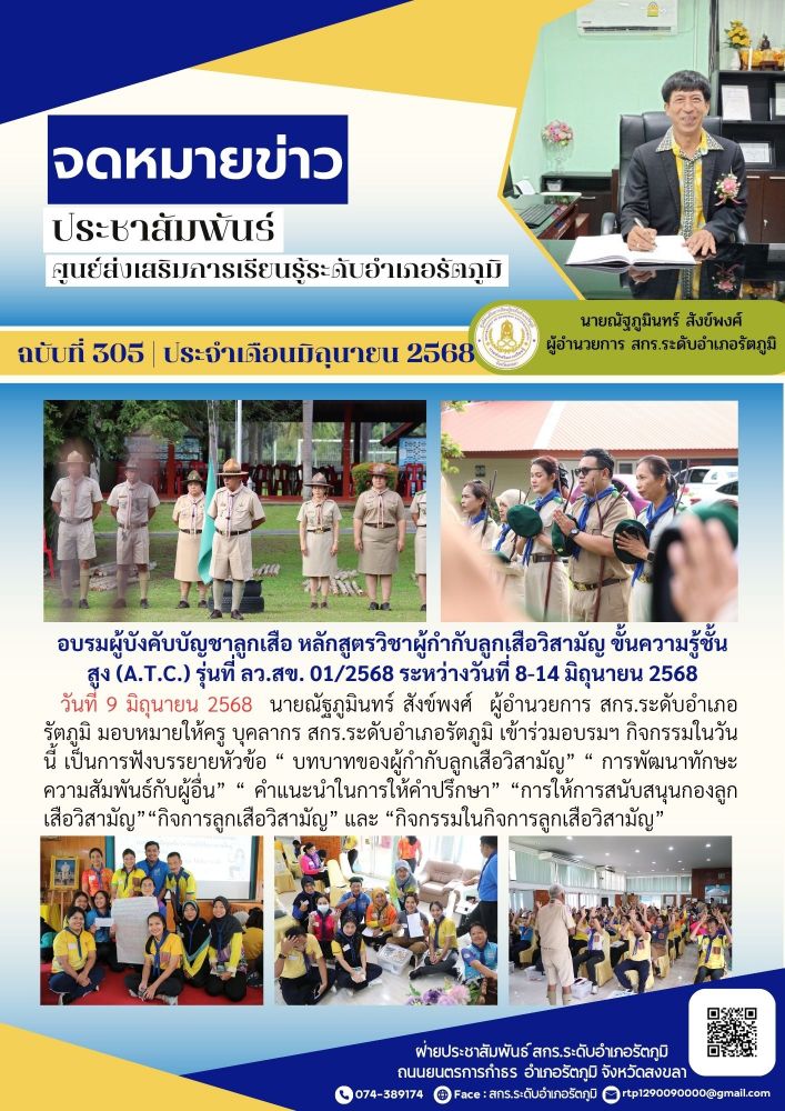 วันที่ 9 มิถุนายน 2568 นายณัฐภูมินทร์ สังข์พงศ์ ผู้อำนวยการ สกร.ระดับอำเภอรัตภูมิ มอบหมายให้ครู บุคลากร สกร.ระดับอำเภอรัตภูมิ เข้าร่วมอบรมฯ กิจกรรมในวันนี้ เป็นการฟังบรรยายหัวข้อ “ บทบาทของผู้กำกับลูกเสือวิสามัญ” “ การพัฒนาทักษะความสัมพันธ์กับผู้อื่น” “ คำแนะนำในการให้คำปรึกษา” “การให้การสนับสนุนกองลูกเสือวิสามัญ”“กิจการลูกเสือวิสามัญ” และ “กิจกรรมในกิจการลูกเสือวิสามัญ”