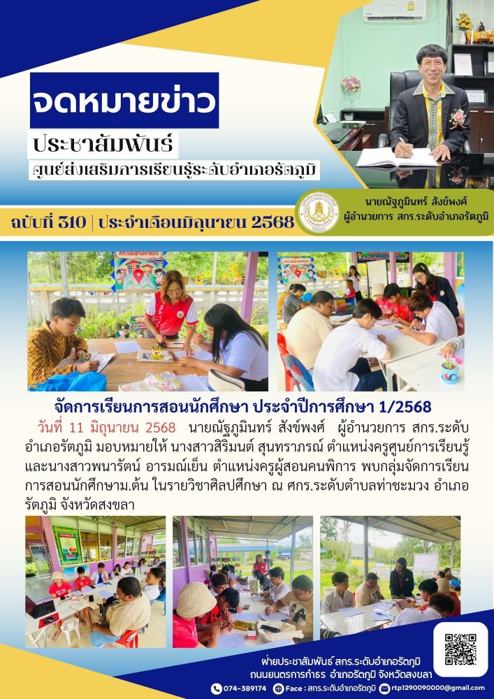 วันที่ 11 มิถุนายน 2568 นายณัฐภูมินทร์ สังข์พงศ์ ผู้อำนวยการ สกร.ระดับอำเภอรัตภูมิ มอบหมายให้ นางสาวสิริมนต์ สุนทราภรณ์ ตำแหน่งครูศูนย์การเรียนรู้ และนางสาวพนารัตน์ อารมณ์เย็น ตำแหน่งครูผู้สอนคนพิการ พบกลุ่มจัดการเรียนการสอนนักศึกษาม.ต้น ในรายวิชาศิลปศึกษา ณ ศกร.ระดับตำบลท่าชะมวง อำเภอรัตภูมิ จังหวัดสงขลา