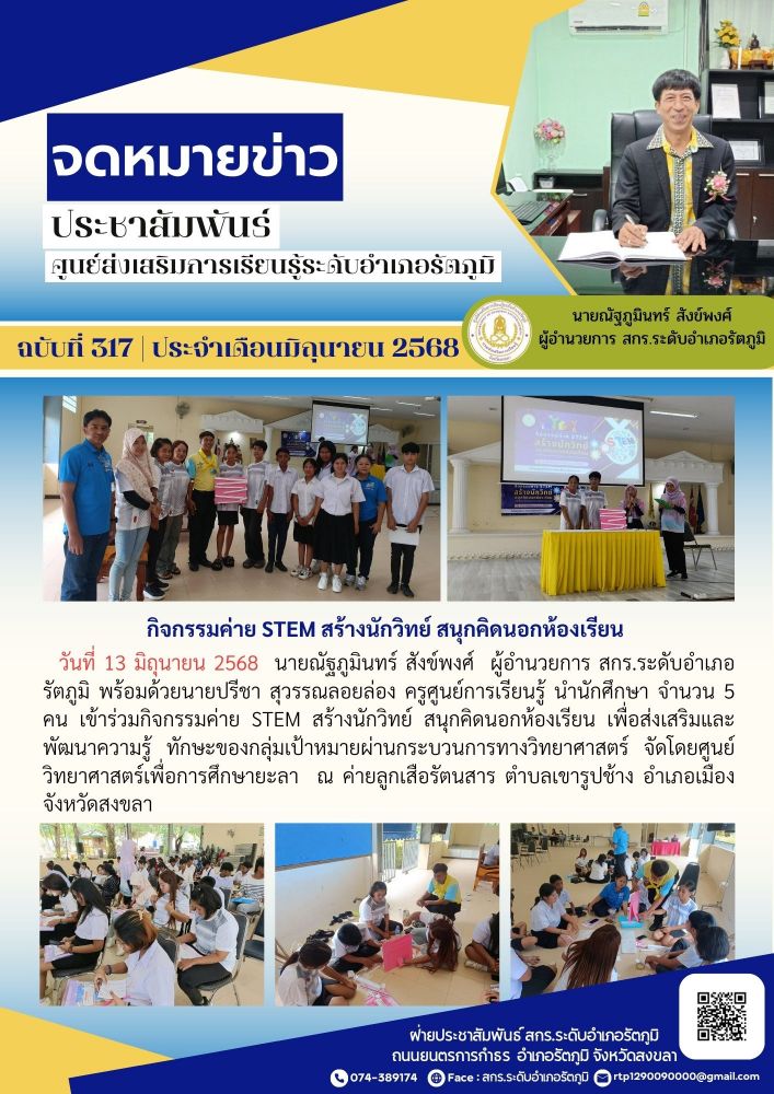 วันที่ 13 มิถุนายน 2568 นายณัฐภูมินทร์ สังข์พงศ์ ผู้อำนวยการ สกร.ระดับอำเภอรัตภูมิ พร้อมด้วยนายปรีชา สุวรรณลอยล่อง ครูศูนย์การเรียนรู้ นำนักศึกษา จำนวน 5 คน เข้าร่วมกิจกรรมค่าย STEM สร้างนักวิทย์ สนุกคิดนอกห้องเรียน เพื่อส่งเสริมและพัฒนาความรู้ ทักษะของกลุ่มเป้าหมายผ่านกระบวนการทางวิทยาศาสตร์ จัดโดยศูนย์วิทยาศาสตร์เพื่อการศึกษายะลา ณ ค่ายลูกเสือรัตนสาร ตำบลเขารูปช้าง อำเภอเมือง จังหวัดสงขลา