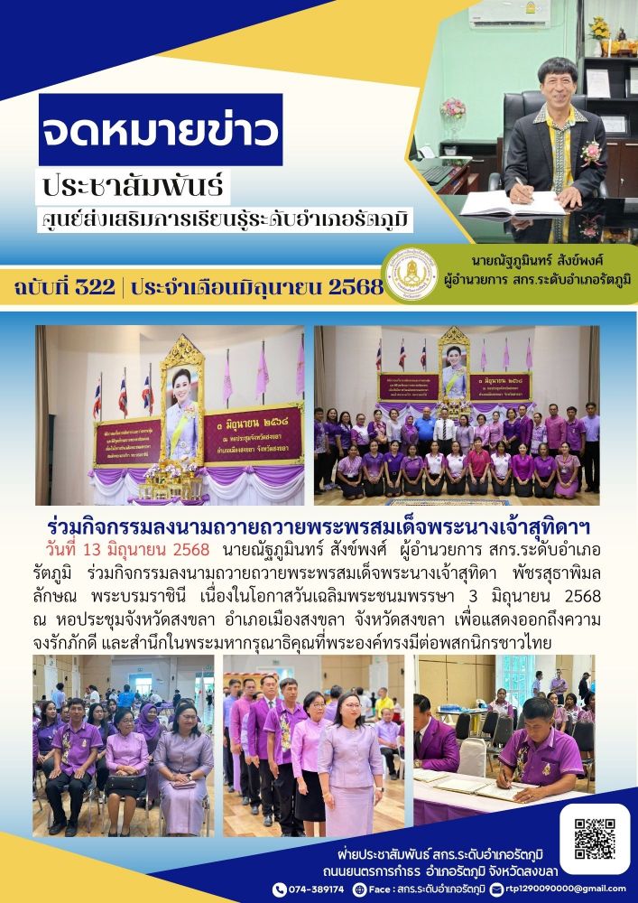 วันที่ 13 มิถุนายน 2568 นายณัฐภูมินทร์ สังข์พงศ์ ผู้อำนวยการ สกร.ระดับอำเภอรัตภูมิ ร่วมกิจกรรมลงนามถวายถวายพระพรสมเด็จพระนางเจ้าสุทิดา พัชรสุธาพิมล ลักษณ พระบรมราชินี เนื่องในโอกาสวันเฉลิมพระชนมพรรษา 3 มิถุนายน 2568 ณ หอประชุมจังหวัดสงขลา อำเภอเมืองสงขลา จังหวัดสงขลา เพื่อแสดงออกถึงความจงรักภักดี และสำนึกในพระมหากรุณาธิคุณที่พระองค์ทรงมีต่อพสกนิกรชาวไทย