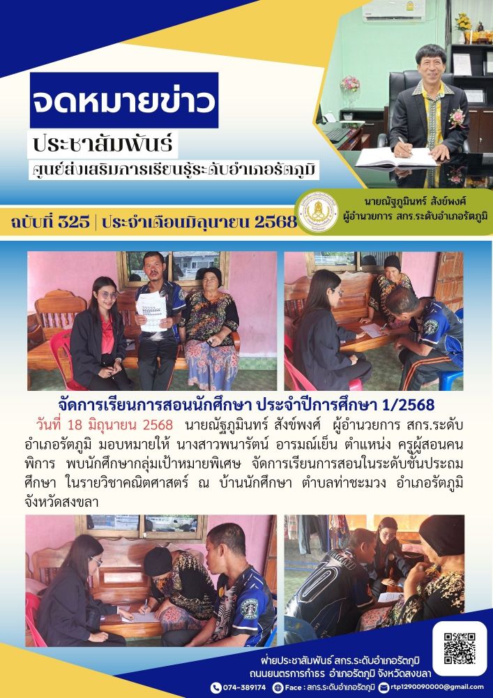 วันที่ 18 มิถุนายน 2568 นายณัฐภูมินทร์ สังข์พงศ์ ผู้อำนวยการ สกร.ระดับอำเภอรัตภูมิ มอบหมายให้ นางสาวพนารัตน์ อารมณ์เย็น ตำแหน่ง ครูผู้สอนคนพิการ พบนักศึกษากลุ่มเป้าหมายพิเศษ จัดการเรียนการสอนในระดับชั้นประถมศึกษา ในรายวิชาคณิตศาสตร์ ณ บ้านนักศึกษา ตำบลท่าชะมวง อำเภอรัตภูมิ จังหวัดสงขลา