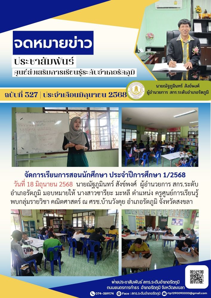 วันที่ 18 มิถุนายน 2568 นายณัฐภูมินทร์ สังข์พงศ์ ผู้อำนวยการ สกร.ระดับอำเภอรัตภูมิ มอบหมายให้ นางสาวซารียะ มะหลี ตำแหน่ง ครูศูนย์การเรียนรู้ พบกลุ่มรายวิชา คณิตศาสตร์ ณ ศรช.บ้านวังคุย อำเภอรัตภูมิ จังหวัดสงขลา