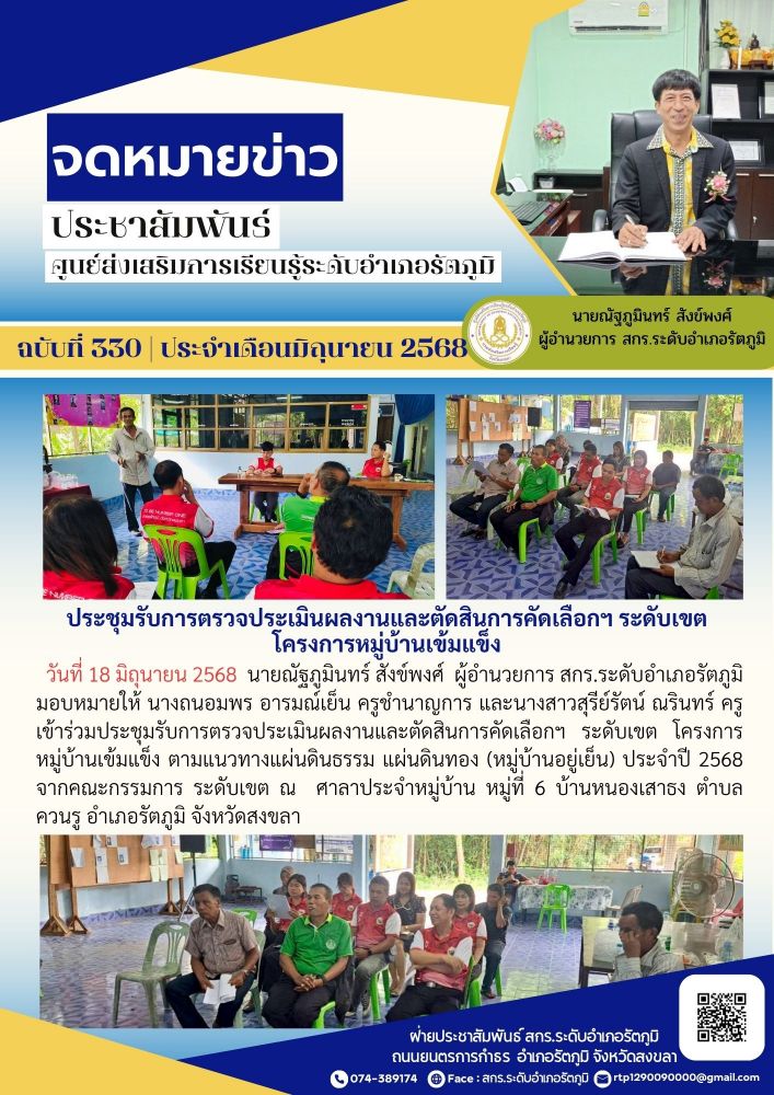 วันที่ 18 มิถุนายน 2568 นายณัฐภูมินทร์ สังข์พงศ์ ผู้อำนวยการ สกร.ระดับอำเภอรัตภูมิ มอบหมายให้ นางถนอมพร อารมณ์เย็น ครูชำนาญการ และนางสาวสุรีย์รัตน์ ณรินทร์ ครู เข้าร่วมประชุมรับการตรวจประเมินผลงานและตัดสินการคัดเลือกฯ ระดับเขต โครงการหมู่บ้านเข้มแข็ง ตามแนวทางแผ่นดินธรรม แผ่นดินทอง (หมู่บ้านอยู่เย็น) ประจำปี 2568 จากคณะกรรมการ ระดับเขต ณ ศาลาประจำหมู่บ้าน หมู่ที่ 6 บ้านหนองเสาธง ตำบล ควนรู อำเภอรัตภูมิ จังหวัดสงขลา