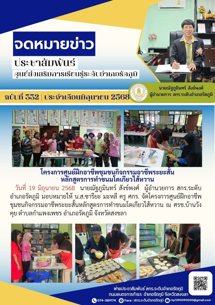 วันที่ 19 มิถุนายน 2568 นายณัฐภูมินทร์ สังข์พงศ์ ผู้อำนวยการ สกร.ระดับอำเภอรัตภูมิ มอบหมายให้ น.ส.ซารียะ มะหลี ครู ศกร. จัดโครงการศูนย์ฝึกอาชีพชุมชนกิจกรรมอาชีพระยะสั้นหลักสูตรการทำขนมโตเกียวไส้หวาน ณ ศรช.บ้านวังคุย ตำบลกำแพงเพชร อำเภอรัตภูมิ จังหวัดสงขลา