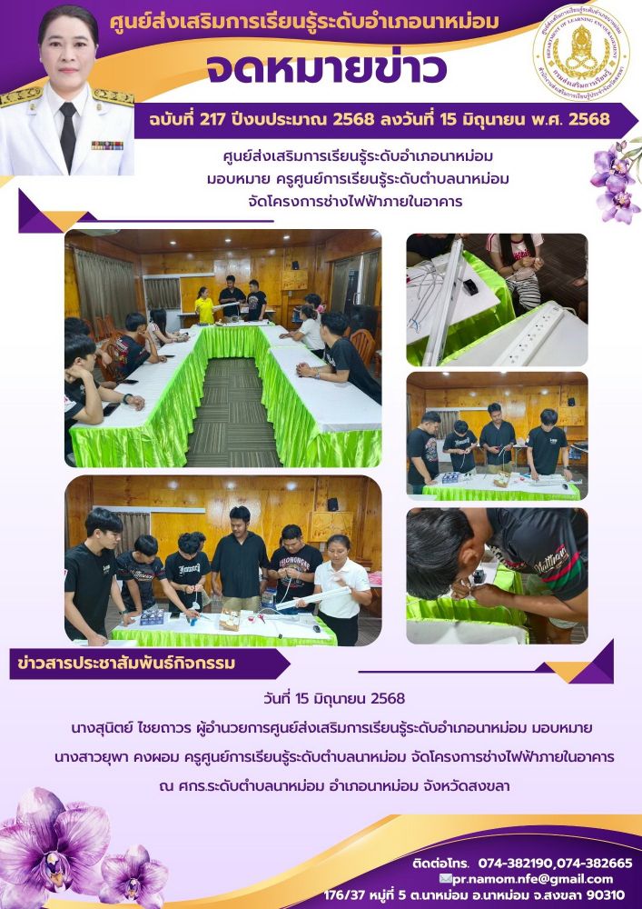 ศูนย์ส่งเสริมการเรียนรู้ระดับอำเภอนาหม่อม มอบหมาย ครูศูนย์การเรียนรู้ระดับตำบลนาหม่อม จัดโครงการช่างไฟฟ้าภายในอาคาร