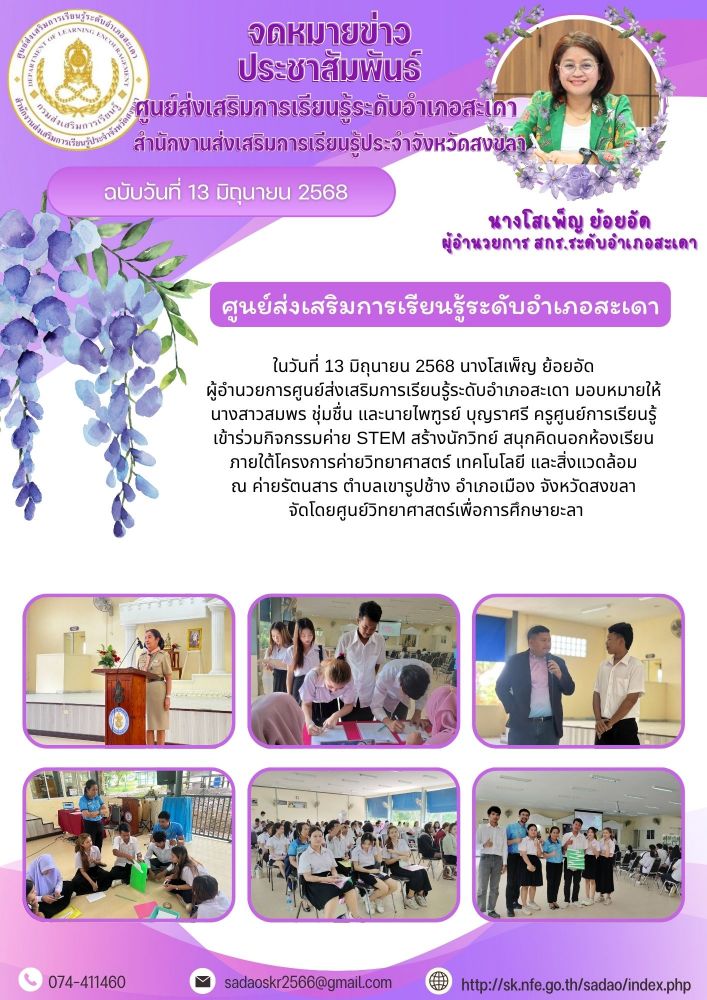 ศูนย์ส่งเสริมการเรียนรู้ระดับอำเภอสะเดา เข้าร่วมกิจกรรมค่าย STEM สร้างนักวิทย์ สนุกคิดนอกห้องเรียน ภายใต้โครงการค่ายวิทยาศาสตร์ เทคโนโลยี และสิ่งแวดล้อม