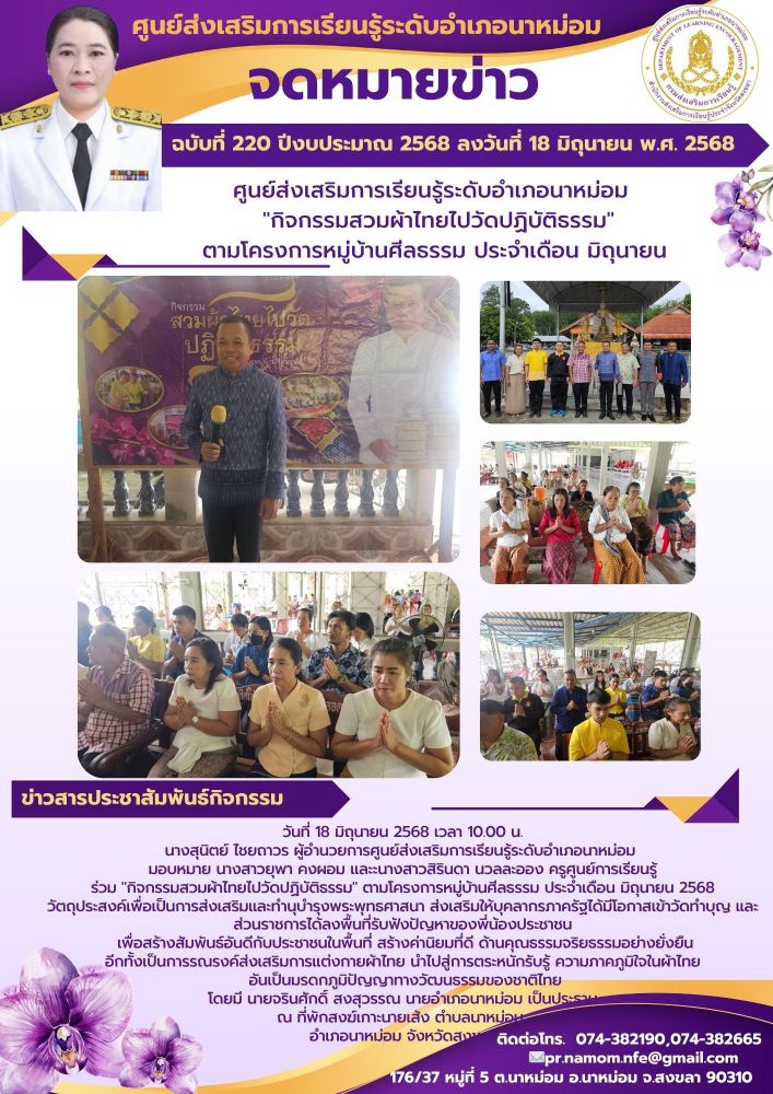 ร่วม "กิจกรรมสวมผ้าไทยไปวัดปฏิบัติธรรม" ตามโครงการหมู่บ้านศีลธรรม ประจำเดือน มิถุนายน วัตถุประสงค์เพื่อเป็นการส่งเสริมและทำนุบำรุงพระพุทธศาสนา ส่งเสริมให้บุคลากรภาครัฐได้มีโอกาสเข้าวัดทำบุญ และส่วนราชการได้ลงพื้นที่รับฟังปัญหาของพี่น้องประชาชน เพื่อสร้างสัมพันธ์อันดีกับประชาชนในพื้นที่ สร้างค่านิยมที่ดี ด้านคุณธรรมจริยธรรมอย่างยั่งยืน