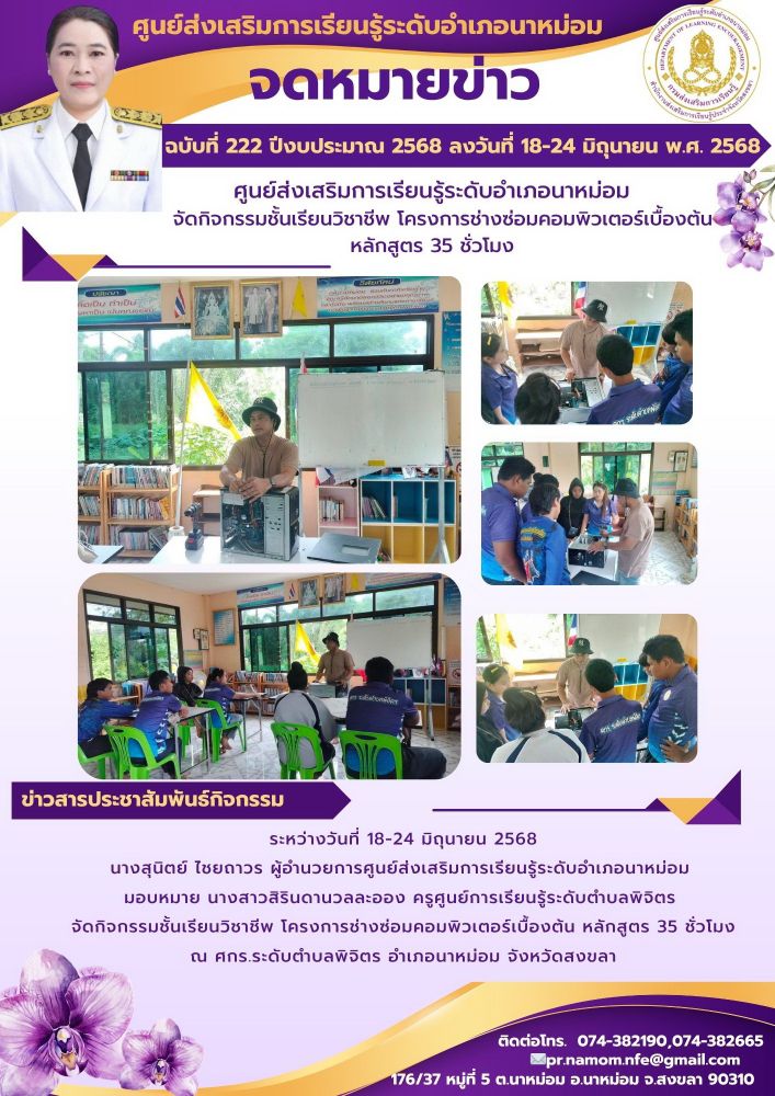 นางสุนิตย์ ไชยถาวร ผู้อำนวยการศูนย์ส่งเสริมการเรียนรู้ระดับอำเภอนาหม่อม มอบหมาย นางสาวสิรินดานวลละออง ครูศูนย์การเรียนรู้ระดับตำบลพิจิตร จัดกิจกรรมชั้นเรียนวิชาชีพ โครงการช่างซ่อมคอมพิวเตอร์เบื้องต้น หลักสูตร 35 ชั่วโมง