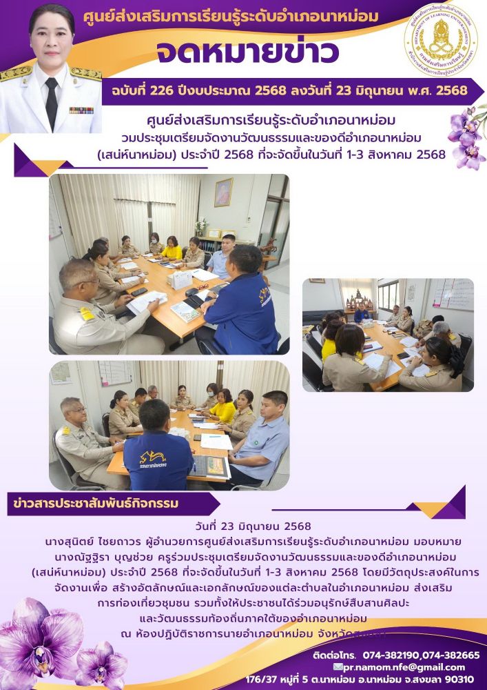 นางสุนิตย์ ไชยถาวร ผู้อำนวยการศูนย์ส่งเสริมการเรียนรู้ระดับอำเภอนาหม่อม มอบหมาย นางณัฐฐิรา บุญช่วย ครูร่วมประชุมเตรียมจัดงานวัฒนธรรมและของดีอำเภอนาหม่อม (เสน่ห์นาหม่อม) ประจำปี 2568 ที่จะจัดขึ้นในวันที่ 1-3 สิงหาคม 2568 โดยมีวัตถุประสงค์ในการจัดงานเพื่อ สร้างอัตลักษณ์และเอกลักษณ์ของแต่ละตำบลในอำเภอนาหม่อม ส่งเสริมการท่องเที่ยวชุมชน รวมทั้งให้ประชาชนได้ร่วมอนุรักษ์สืบสานศิลปะและวัฒนธรรมท้องถิ่นภาคใต้ของอำเภอนาหม่อม