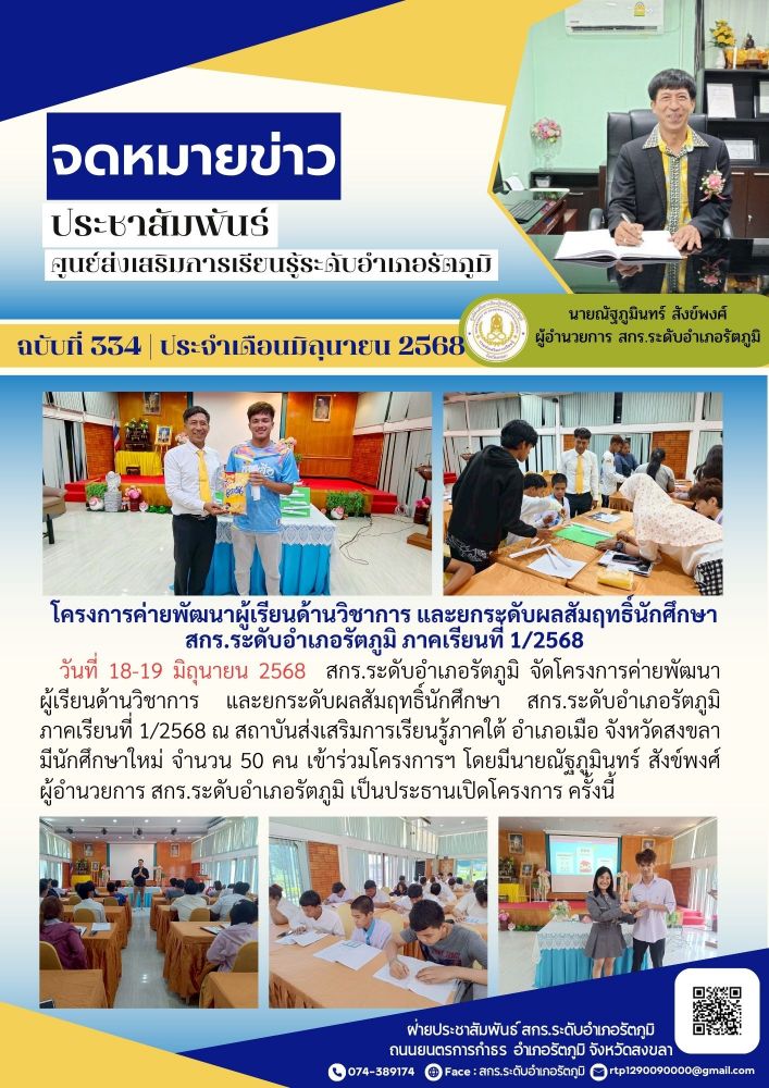 วันที่ 18-19 มิถุนายน 2568 สกร.ระดับอำเภอรัตภูมิ จัดโครงการค่ายพัฒนา ผู้เรียนด้านวิชาการ และยกระดับผลสัมฤทธิ์นักศึกษา สกร.ระดับอำเภอรัตภูมิ ภาคเรียนที่ 1/2568 ณ สถาบันส่งเสริมการเรียนรู้ภาคใต้ อำเภอเมือง จังหวัดสงขลา มีนักศึกษาใหม่ จำนวน 50 คน เข้าร่วมโครงการฯ โดยมีนายณัฐภูมินทร์ สังข์พงศ์ ผู้อำนวยการ สกร.ระดับอำเภอรัตภูมิ เป็นประธานเปิดโครงการ ครั้งนี้