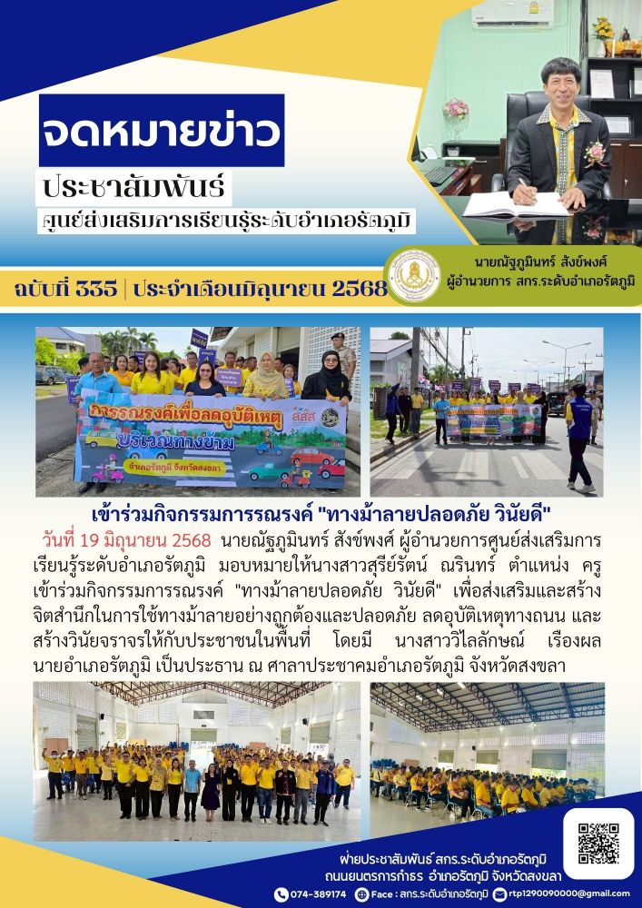 วันที่ 19 มิถุนายน 2568 นายณัฐภูมินทร์ สังข์พงศ์ ผู้อำนวยการศูนย์ส่งเสริมการเรียนรู้ระดับอำเภอรัตภูมิ มอบหมายให้นางสาวสุรีย์รัตน์ ณรินทร์ ตำแหน่ง ครู เข้าร่วมกิจกรรมการรณรงค์ "ทางม้าลายปลอดภัย วินัยดี" เพื่อส่งเสริมและสร้างจิตสำนึกในการใช้ทางม้าลายอย่างถูกต้องและปลอดภัย ลดอุบัติเหตุทางถนน และสร้างวินัยจราจรให้กับประชาชนในพื้นที่ โดยมี นางสาววิไลลักษณ์ เรืองผล นายอำเภอรัตภูมิ เป็นประธาน ณ ศาลาประชาคมอำเภอรัตภูมิ จังหวัดสงขลา