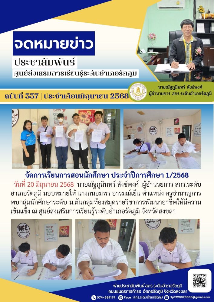วันที่ 20 มิถุนายน 2568 นายณัฐภูมินทร์ สังข์พงศ์ ผู้อำนวยการ สกร.ระดับอำเภอรัตภูมิ มอบหมายให้ นางถนอมพร อารมณ์เย็น ตำแหน่ง ครูชำนาญการ พบกลุ่มนักศึกษาระดับ ม.ต้นกลุ่มห้องสมุดรายวิชาการพัฒนาอาชีพให้มีความเข้มแข็ง ณ ศูนย์ส่งเสริมการเรียนรู้ระดับอำเภอรัตภูมิ จังหวัดสงขลา