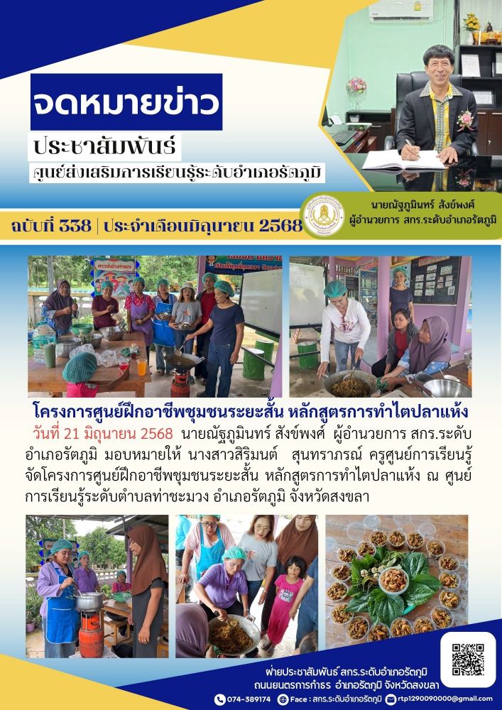 วันที่ 21 มิถุนายน 2568 นายณัฐภูมินทร์ สังข์พงศ์ ผู้อำนวยการ สกร.ระดับอำเภอรัตภูมิ มอบหมายให้ นางสาวสิริมนต์ สุนทราภรณ์ ครูศูนย์การเรียนรู้ จัดโครงการศูนย์ฝึกอาชีพชุมชนระยะสั้น หลักสูตรการทำไตปลาแห้ง ณ ศูนย์การเรียนรู้ระดับตำบลท่าชะมวง อำเภอรัตภูมิ จังหวัดสงขลา