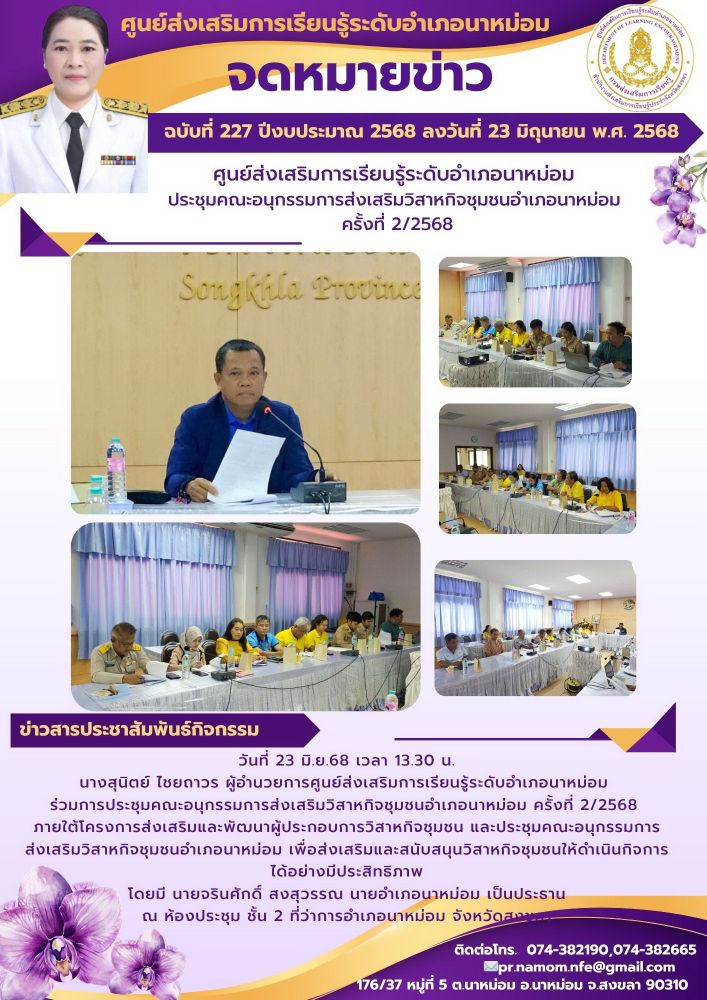 นางสุนิตย์ ไชยถาวร ผู้อำนวยการศูนย์ส่งเสริมการเรียนรู้ระดับอำเภอนาหม่อม ร่วมการประชุมคณะอนุกรรมการส่งเสริมวิสาหกิจชุมชนอำเภอนาหม่อม ครั้งที่ 2/2568 ภายใต้โครงการส่งเสริมและพัฒนาผู้ประกอบการวิสาหกิจชุมชน และประชุมคณะอนุกรรมการส่งเสริมวิสาหกิจชุมชนอำเภอนาหม่อม เพื่อส่งเสริมและสนับสนุนวิสาหกิจชุมชนให้ดำเนินกิจการได้อย่างมีประสิทธิภาพ