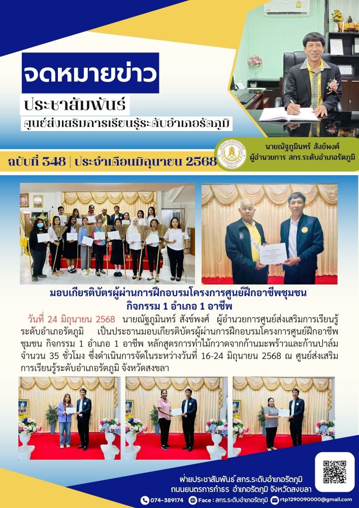 วันที่ 24 มิถุนายน 2568 นายณัฐภูมินทร์ สังข์พงศ์ ผู้อำนวยการศูนย์ส่งเสริมการเรียนรู้ระดับอำเภอรัตภูมิ เป็นประธานมอบเกียรติบัตรผู้ผ่านการฝึกอบรมโครงการศูนย์ฝึกอาชีพชุมชน กิจกรรม 1 อำเภอ 1 อาชีพ หลักสูตรการทำไม้กวาดจากก้านมะพร้าวและก้านปาล์ม จำนวน 35 ชั่วโมง ซึ่งดำเนินการจัดในระหว่างวันที่ 16-24 มิถุนายน 2568 ณ ศูนย์ส่งเสริมการเรียนรู้ระดับอำเภอรัตภูมิ จังหวัดสงขลา