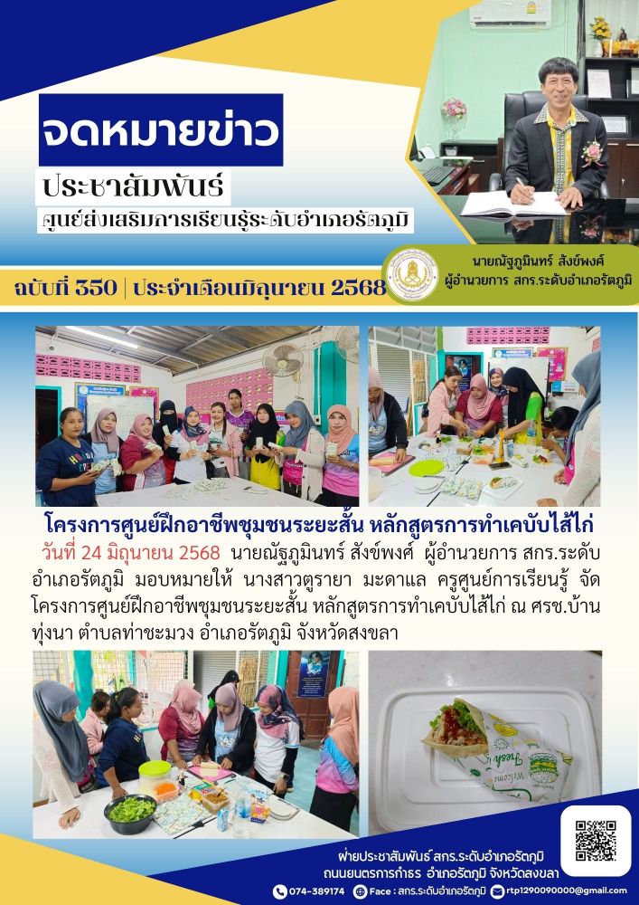วันที่ 24 มิถุนายน 2568 นายณัฐภูมินทร์ สังข์พงศ์ ผู้อำนวยการ สกร.ระดับอำเภอรัตภูมิ มอบหมายให้ นางสาวตูรายา มะดาแล ครูศูนย์การเรียนรู้ จัดโครงการศูนย์ฝึกอาชีพชุมชนระยะสั้น หลักสูตรการทำเคบับไส้ไก่ ณ ศรช.บ้านทุ่งนา ตำบลท่าชะมวง อำเภอรัตภูมิ จังหวัดสงขลา