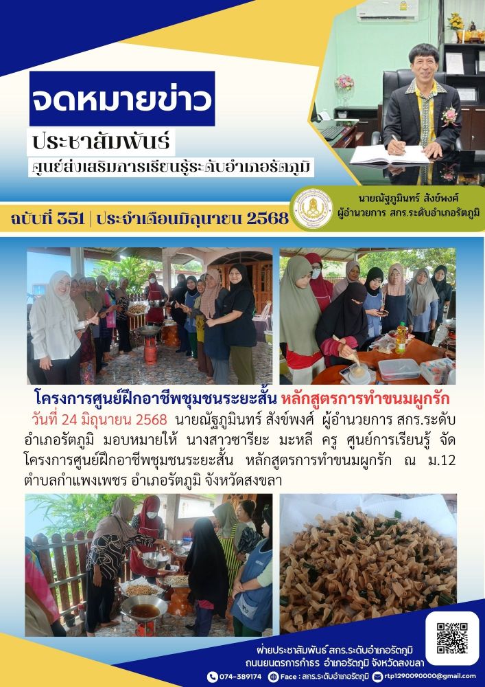 วันที่ 24 มิถุนายน 2568 นายณัฐภูมินทร์ สังข์พงศ์ ผู้อำนวยการ สกร.ระดับอำเภอรัตภูมิ มอบหมายให้ นางสาวซารียะ มะหลี ครู ศูนย์การเรียนรู้ จัดโครงการศูนย์ฝึกอาชีพชุมชนระยะสั้น หลักสูตรการทำขนมผูกรัก ณ ม.12 ตำบลกำแพงเพชร อำเภอรัตภูมิ จังหวัดสงขลา