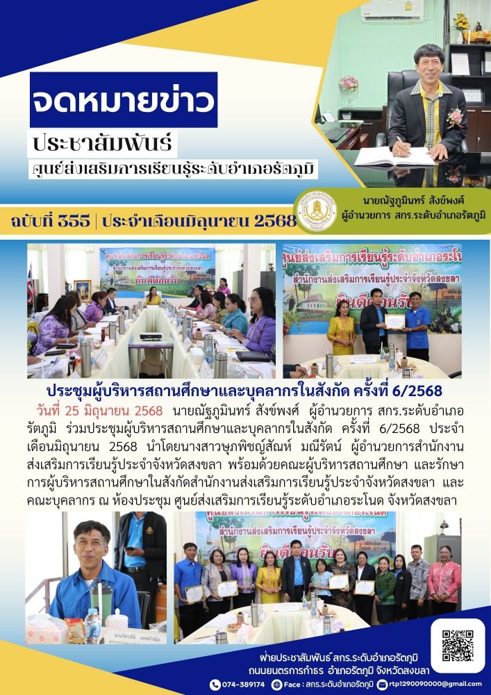 วันที่ 25 มิถุนายน 2568 นายณัฐภูมินทร์ สังข์พงศ์ ผู้อำนวยการ สกร.ระดับอำเภอรัตภูมิ ร่วมประชุมผู้บริหารสถานศึกษาและบุคลากรในสังกัด ครั้งที่ 6/2568 ประจำเดือนมิถุนายน 2568 นำโดยนางสาวษุภพิชญ์สัณห์ มณีรัตน์ ผู้อำนวยการสำนักงาน ส่งเสริมการเรียนรู้ประจำจังหวัดสงขลา พร้อมด้วยคณะผู้บริหารสถานศึกษา และรักษาการผู้บริหารสถานศึกษาในสังกัดสำนักงานส่งเสริมการเรียนรู้ประจำจังหวัดสงขลา และคณะบุคลากร ณ ห้องประชุม ศูนย์ส่งเสริมการเรียนรู้ระดับอำเภอระโนด จังหวัดสงขลา