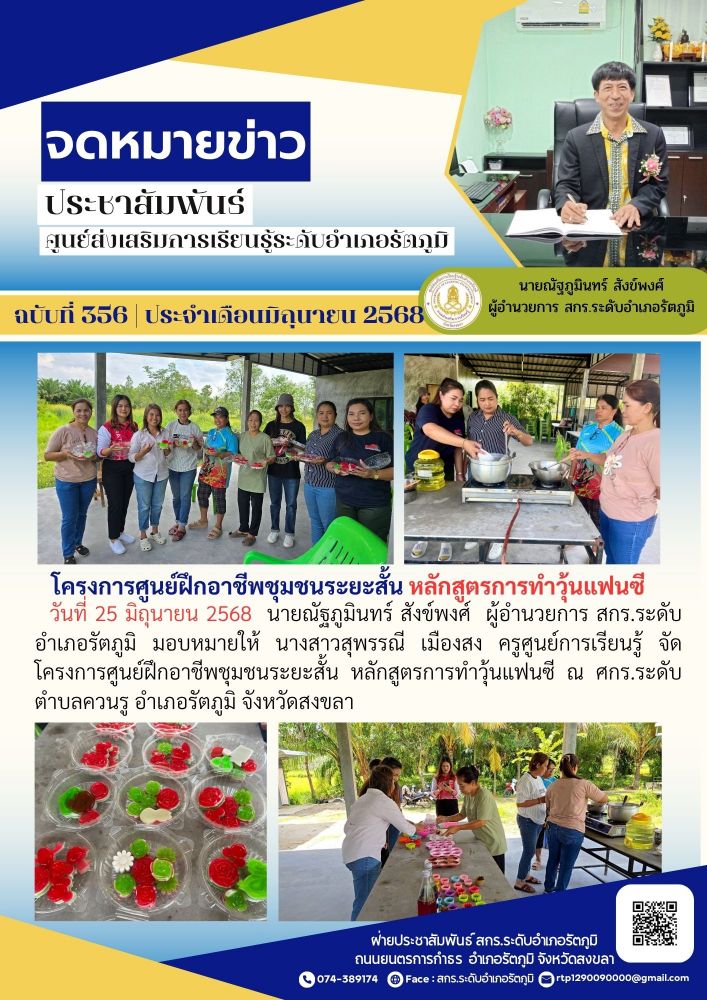 วันที่ 25 มิถุนายน 2568 นายณัฐภูมินทร์ สังข์พงศ์ ผู้อำนวยการ สกร.ระดับอำเภอรัตภูมิ มอบหมายให้ นางสาวสุพรรณี เมืองสง ครูศูนย์การเรียนรู้ จัดโครงการศูนย์ฝึกอาชีพชุมชนระยะสั้น หลักสูตรการทำวุ้นแฟนซี ณ ศกร.ระดับตำบลควนรู อำเภอรัตภูมิ จังหวัดสงขลา
