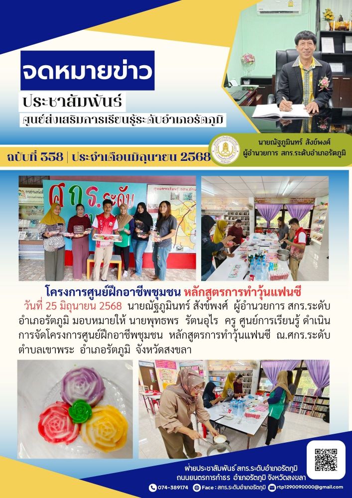 วันที่ 25 มิถุนายน 2568 นายณัฐภูมินทร์ สังข์พงศ์ ผู้อำนวยการ สกร.ระดับอำเภอรัตภูมิ มอบหมายให้ นายพุทธพร รัตนอุไร ครู ศูนย์การเรียนรู้ ดำเนินการจัดโครงการศูนย์ฝึกอาชีพชุมชน หลักสูตรการทำวุ้นแฟนซี ณ.ศกร.ระดับตำบลเขาพระ อำเภอรัตภูมิ จังหวัดสงขลา.