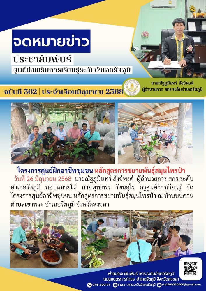วันที่ 26 มิถุนายน 2568 นายณัฐภูมินทร์ สังข์พงศ์ ผู้อำนวยการ สกร.ระดับอำเภอรัตภูมิ มอบหมายให้ นายพุทธพร รัตนอุไร ครูศูนย์การเรียนรู้ จัดโครงการศูนย์อาชีพชุมชน หลักสูตรการขยายพันธุ์สมุนไพรป่า ณ บ้านบนควน ตำบลเขาพระ อำเภอรัตภูมิ จังหวัดสงขลา