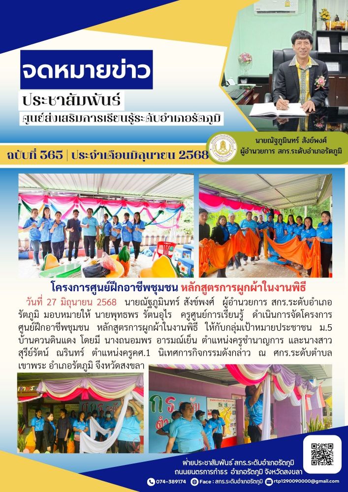 วันที่ 27 มิถุนายน 2568 นายณัฐภูมินทร์ สังข์พงศ์ ผู้อำนวยการ สกร.ระดับอำเภอรัตภูมิ มอบหมายให้ นายพุทธพร รัตนอุไร ครูศูนย์การเรียนรู้ ดำเนินการจัดโครงการศูนย์ฝึกอาชีพชุมชน หลักสูตรการผูกผ้าในงานพิธี ให้กับกลุ่มเป้าหมายประชาชน ม.5 บ้านควนดินแดง โดยมี นางถนอมพร อารมณ์เย็น ตำแหน่งครูชำนาญการ และนางสาวสุรีย์รัตน์ ณรินทร์ ตำแหน่งครูคศ.1 นิเทศการกิจกรรมดังกล่าว ณ ศกร.ระดับตำบล เขาพระ อำเภอรัตภูมิ จีงหวัดสงขลา