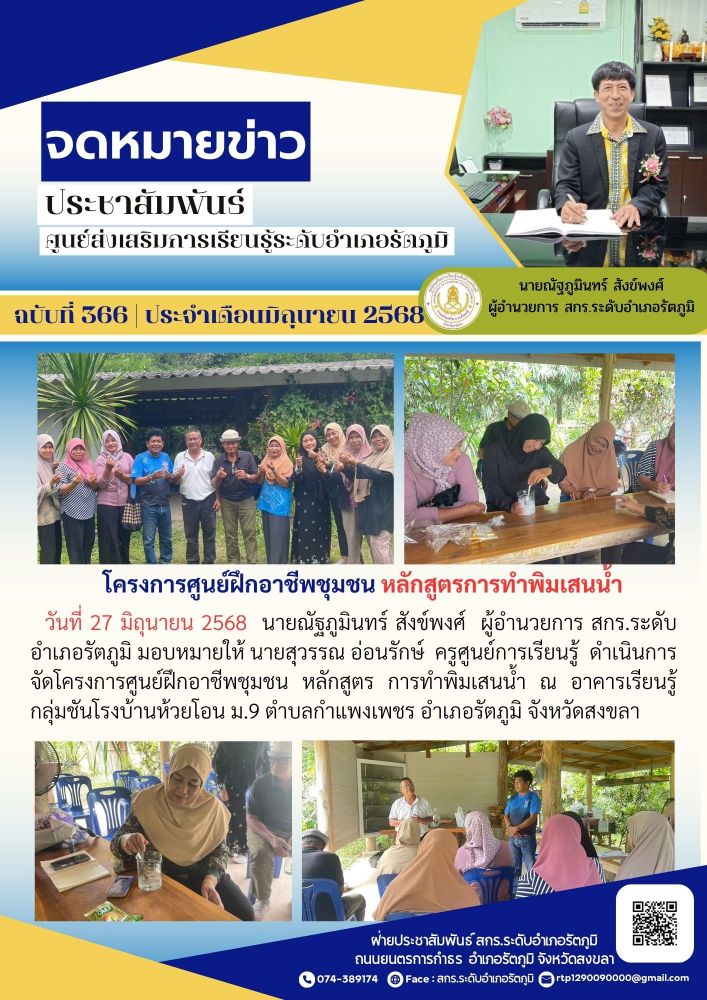 วันที่ 27 มิถุนายน 2568 นายณัฐภูมินทร์ สังข์พงศ์ ผู้อำนวยการ สกร.ระดับอำเภอรัตภูมิ มอบหมายให้ นายสุวรรณ อ่อนรักษ์ ครูศูนย์การเรียนรู้ ดำเนินการจัดโครงการศูนย์ฝึกอาชีพชุมชน หลักสูตร การทำพิมเสนน้ำ ณ อาคารเรียนรู้กลุ่มชันโรงบ้านห้วยโอน ม.9 ตำบลกำแพงเพชร อำเภอรัตภูมิ จังหวัดสงขลา