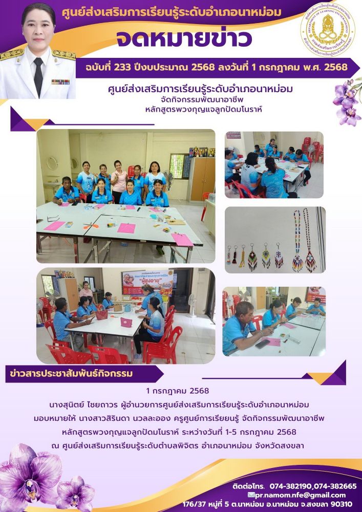 หลักสูตรพวงกุญแจลูกปัดมโนราห์ ระหว่างวันที่ 1-5 กรกฎาคม 2568