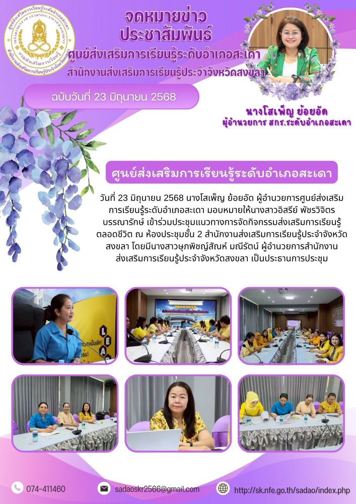 ศูนย์ส่งเสริมการเรียนรู้ระดับอำเภอสะเดา เข้าร่วมประชุมแนวทางการจัดกิจกรรมส่งเสริมการเรียนรู้ ตลอดชีวิต