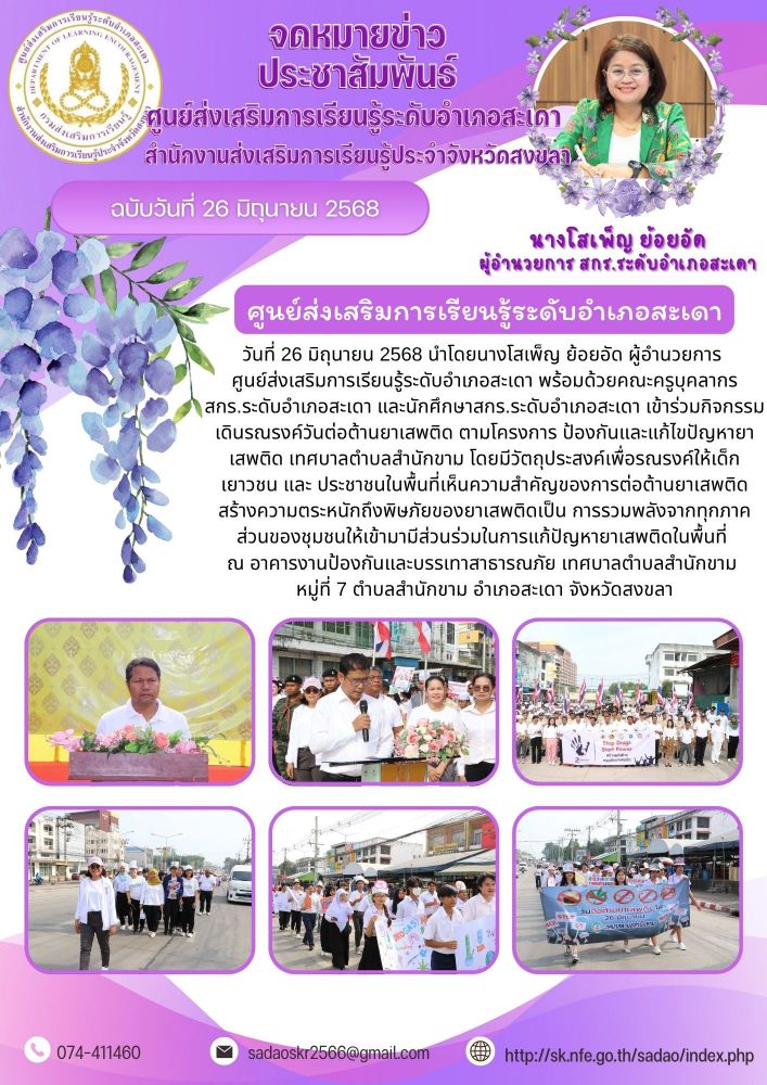ศูนย์ส่งเสริมการเรียนรู้ระดับอำเภอสะเดา เข้าร่วมกิจกรรมเดินรณรงค์วันต่อต้านยาเสพติด ตามโครงการ ป้องกันและแก้ไขปัญหายาเสพติด เทศบาลตำบลสำนักขาม