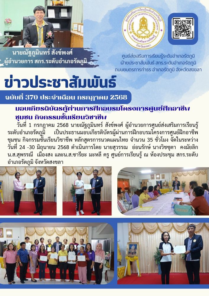 วันที่ 1 กรกฎาคม 2568 นายณัฐภูมินทร์ สังข์พงศ์ ผู้อำนวยการศูนย์ส่งเสริมการเรียนรู้ระดับอำเภอรัตภูมิ เป็นประธานมอบเกียรติบัตรผู้ผ่านการฝึกอบรมโครงการศูนย์ฝึกอาชีพชุมชน กิจกรรมชั้นเรียนวิชาชีพ หลักสูตรการนวดแผนไทย จำนวน 35 ชั่วโมง จัดในระหว่างวันที่ 24 -30 มิถุนายน 2568 ดำเนินการโดย นายสุวรรณ อ่อนรักษ์ นางวิชซุตา คงมัยลิก น.ส.สุพรรณี เมืองสง และน.ส.ซารียะ มะหลี ครู ศูนย์การเรียนรู้ ณ ห้องประชุม สกร.ระดับอำเภอรัตภูมิ จังหวัดสงขลา